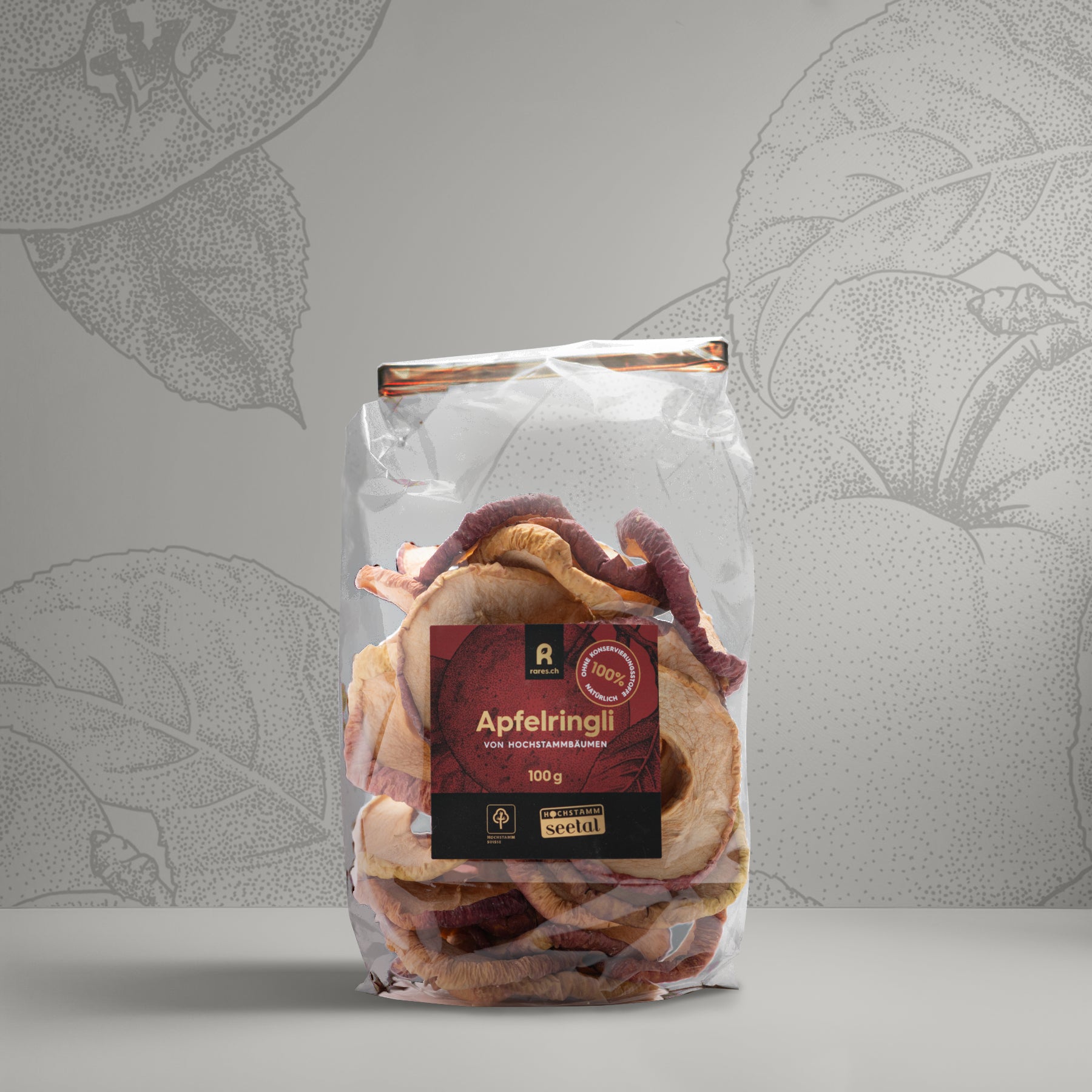 Diese Apfelringli bestehen aus ausgewählten Sorten von Hochstamm-Äpfeln, die nach der Ernte schonend getrocknet werden. Mit dem Genuss dieses Naturproduktes helfen Sie, den Fortbestand der prächtigen Hochstamm-Landschaft in der Schweiz zu erhalten. Produziert und kontrolliert nach den Richtlinien von hochstamm-suisse.ch
