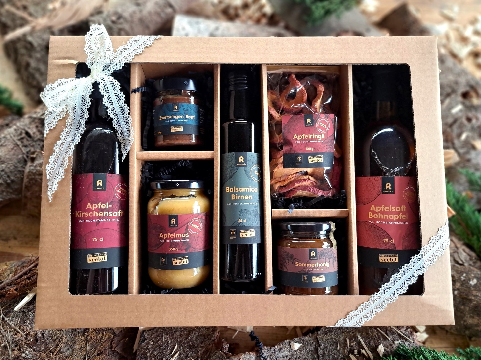 2 Sortenreine Säfte, 1 Senf, 1 Balsamico, 1 Apfelmus, 1 Pack Apfelringli, 1 Sommerhonig