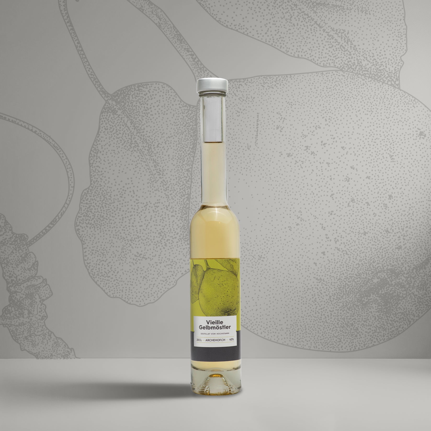 Gelbmöstler ist eine Schweizer Mostbirne und seit über 200 Jahren in der Schweiz verbreitet. Heute ist die Sorte wegen der Feuerbrandanfälligkeit gefährdet. Zwei uralte Gelbmöstlerbäume stehen auf dem Archehof und bereichern das Landschaftsbild. Der sortenreine Brand ist mild, harmonisch und elegant an der Nase.