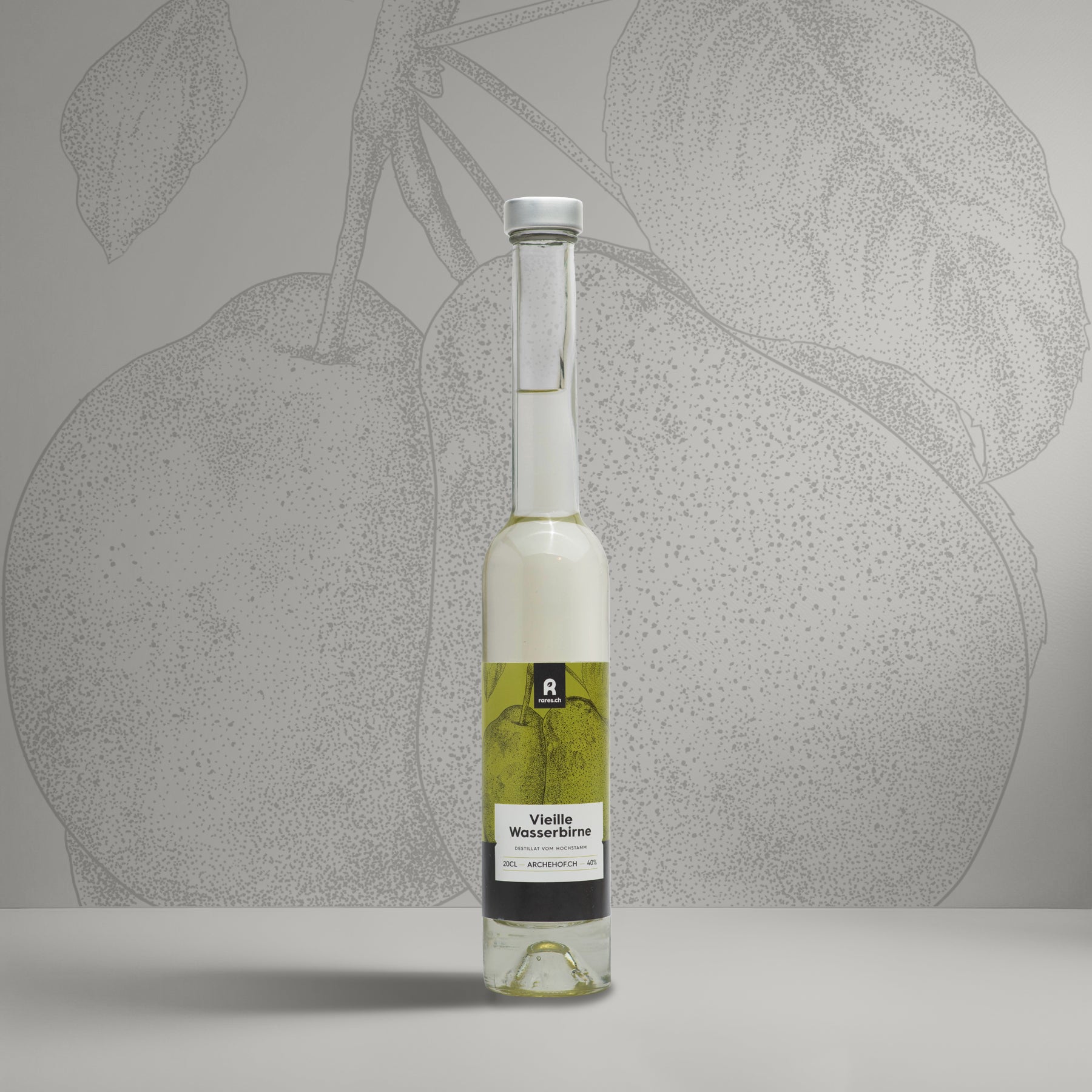Die Schweizer Wasserbirne wurde bereits 1302 erstmals erwähnt und hat einen hohen Saftanteil in der Frucht. Beim Genuss dieses Destillats entsteht ein prickelndes Birnenaroma. Die Frische am Gaumen ist unvergleichbar.